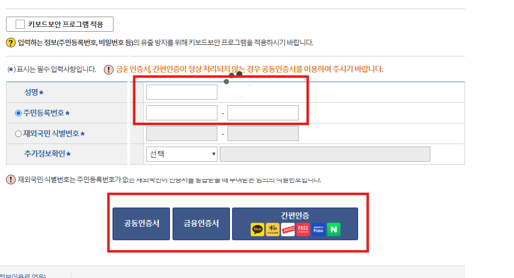- 본인 인증 수단 (공동인증서, 간편 인증)