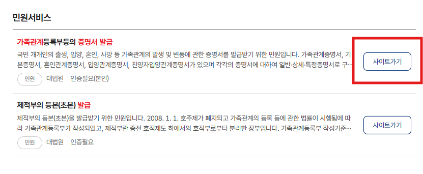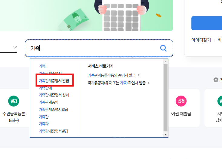- 서비스 검색: 검색창에 "가족관계증명서"를 입력하고 해당 메뉴를 선택합니다.