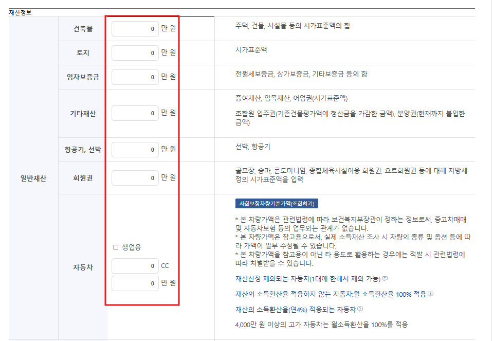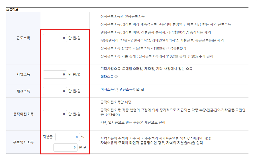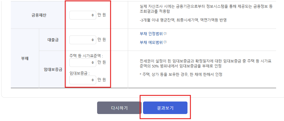 소득과 재산 정보를 정확히 입력해야 신뢰할 수 있는 결과를 얻을 수 있습니다. - 공식 사이트 사용