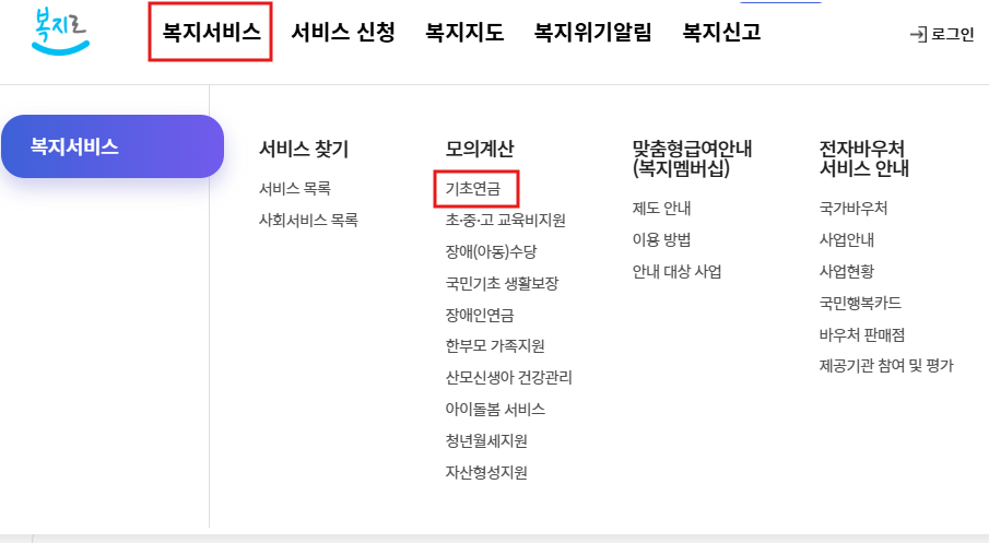 - 이후 제공되는 다양한 모의계산 서비스 중 "기초연금" 항목을 선택합니다.