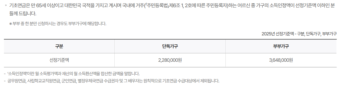 - 소득인정액 기준: 개인 2025년 기준 약 2,280,000원 이하, 부부는 약 3,648,000원 이하