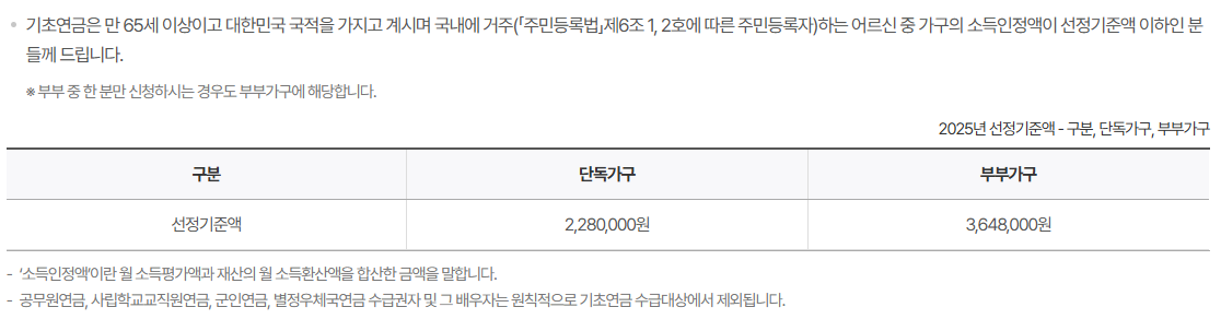 - 2025년 기준: 단독 가구 약 2,280,000원 이하, 부부 가구 약 3,648,000원 이하