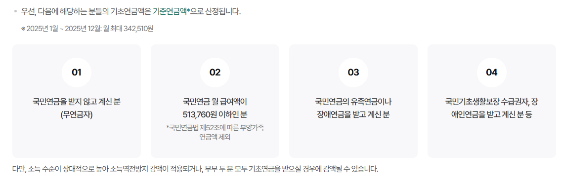 - 국민연금 가입 여부와 상관없이 지원 가능하나, 국민연금 수령액에 따라 차등 지급될 수 있습니다.
