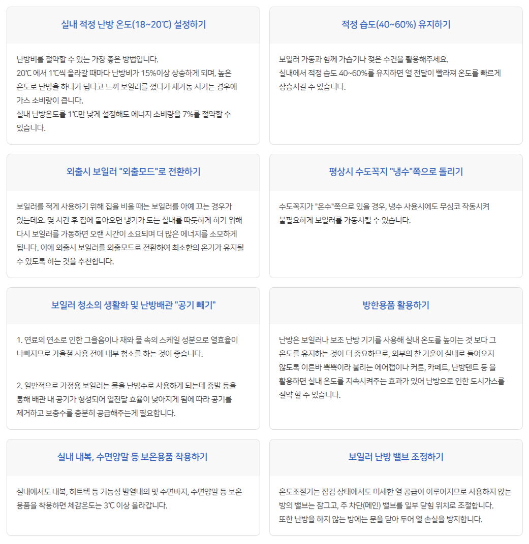 - 겨울철 : 가스 보일러 점검 및 난방 필름 사용.
