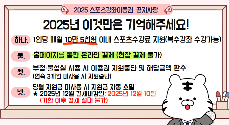 - 스포츠바우처는 반드시 홈페이지를 통한 온라인 결제 방식으로 이용해야 합니다.