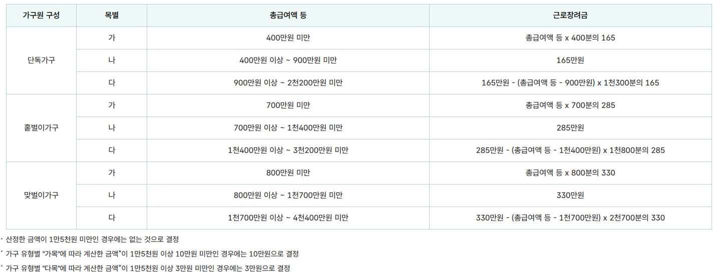 근로장려금의 지급액은 신청자의 소득, 가구원 수, 재산에 따라 다릅니다. 근로장려금의 지급액은 최대 300만 원까지 받을 수 있으며, 세부 지급 기준은 다음과 같습니다