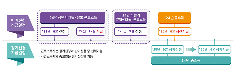 | 2024년 하반기 소득분 2025년 3월 1일 ~ 3월 17일 2025년 상반기 소득분 2025년 9월 1일 ~ 9월 15일 |