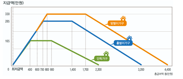 | 소득 기준 | - 단독 가구 연간 총소득 2,200만 원 미만 - 홑벌이 가구 연간 총소득 3,200만 원 미만 - 맞벌이 가구 연간 총소득 4,400만 원 미만 |